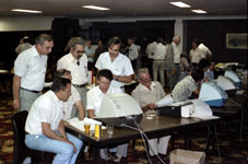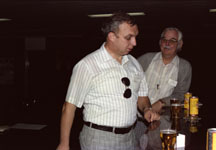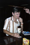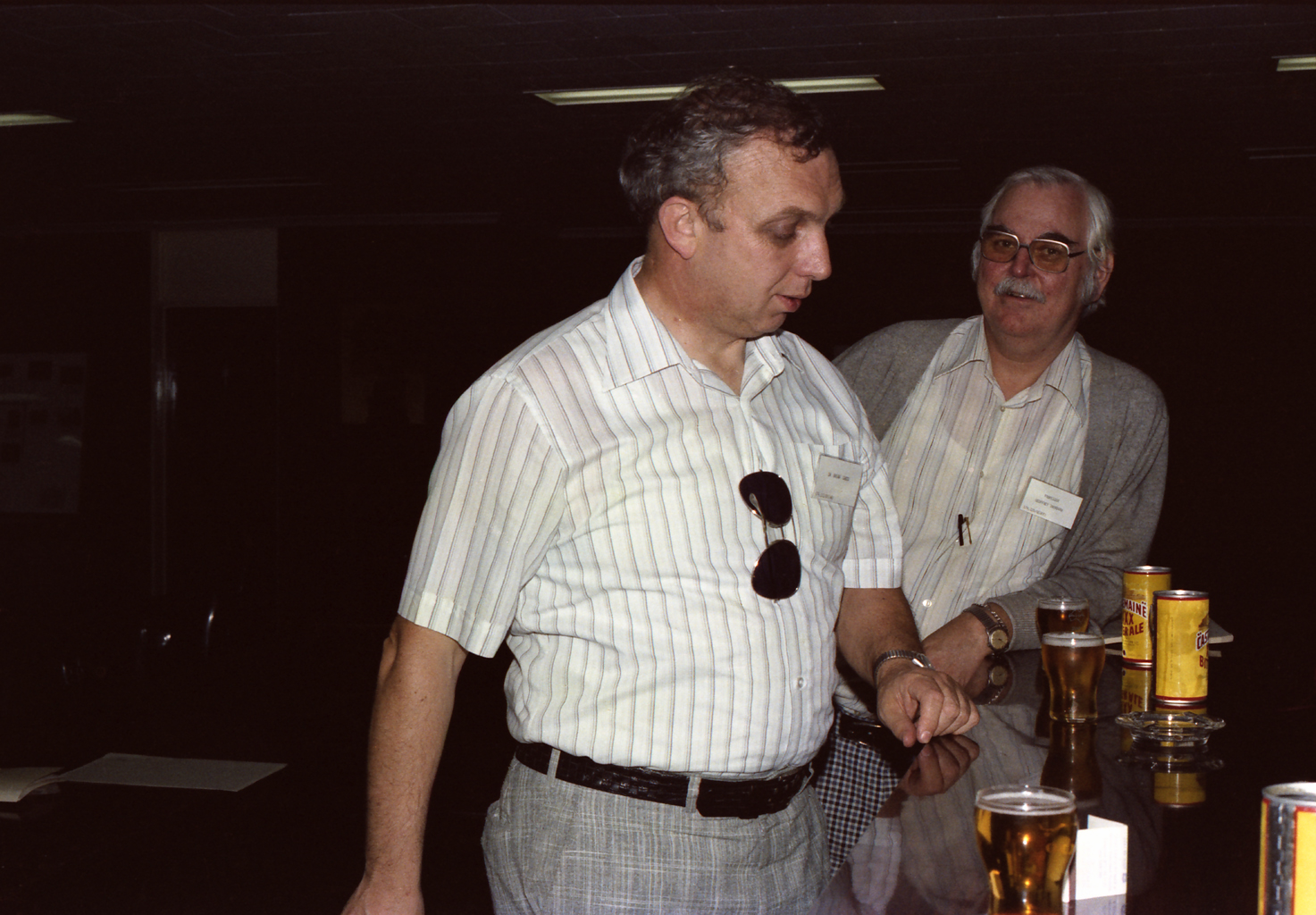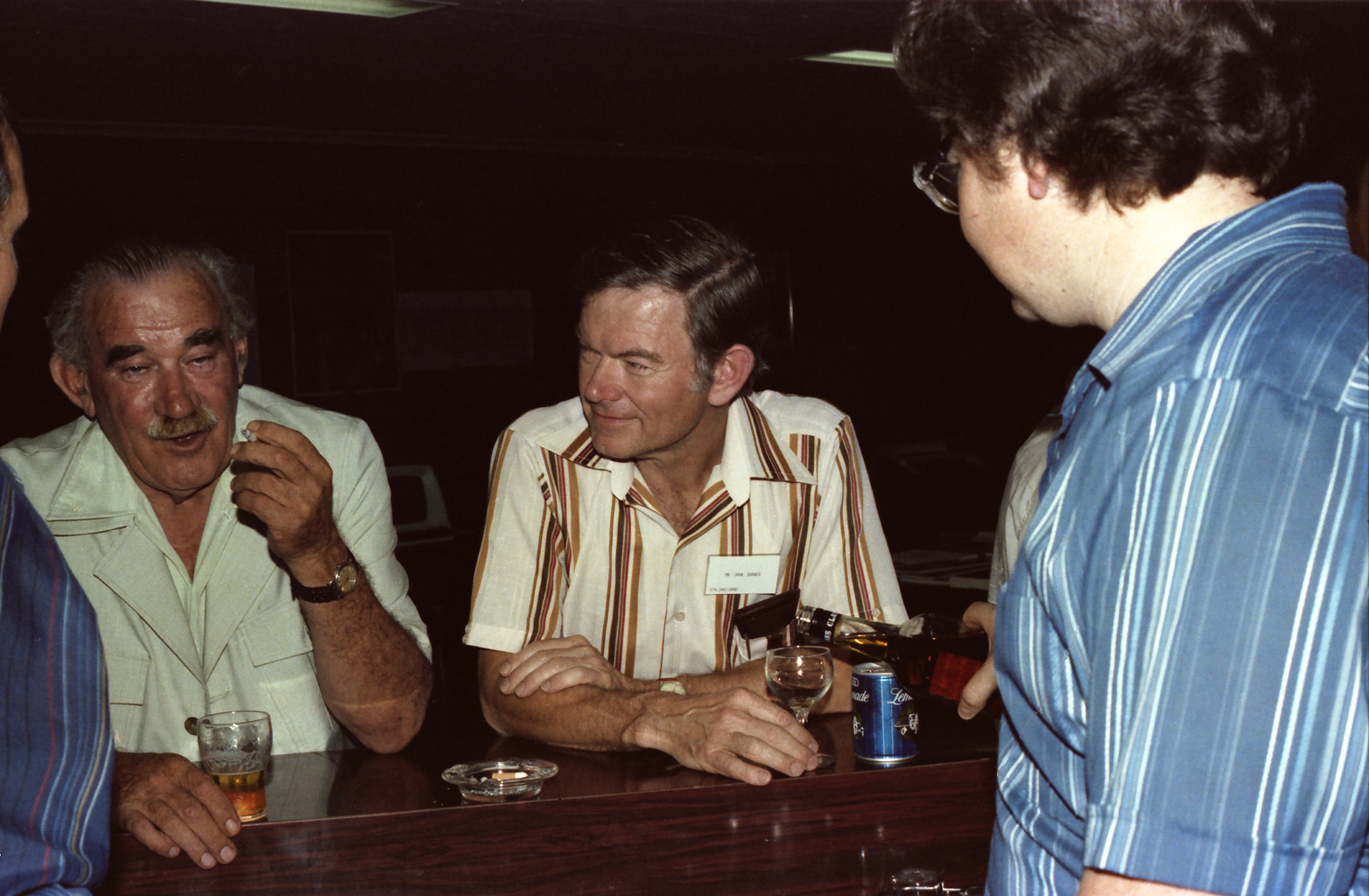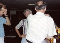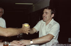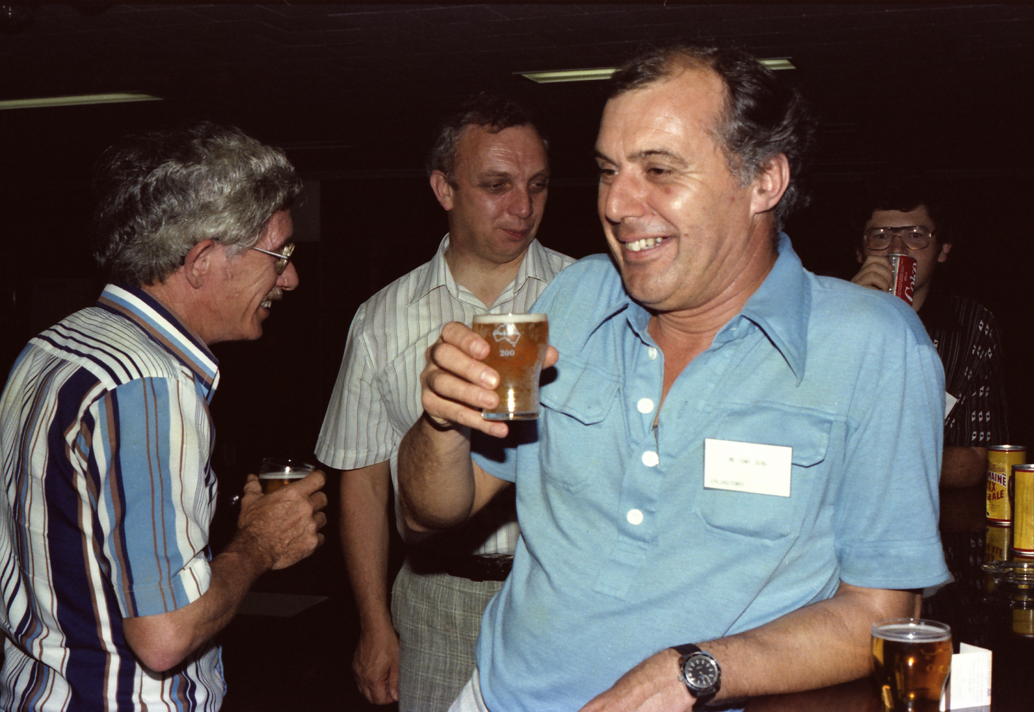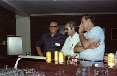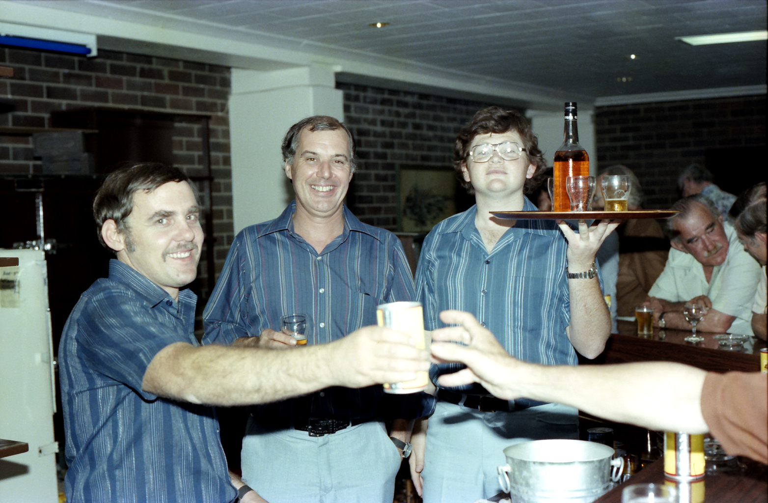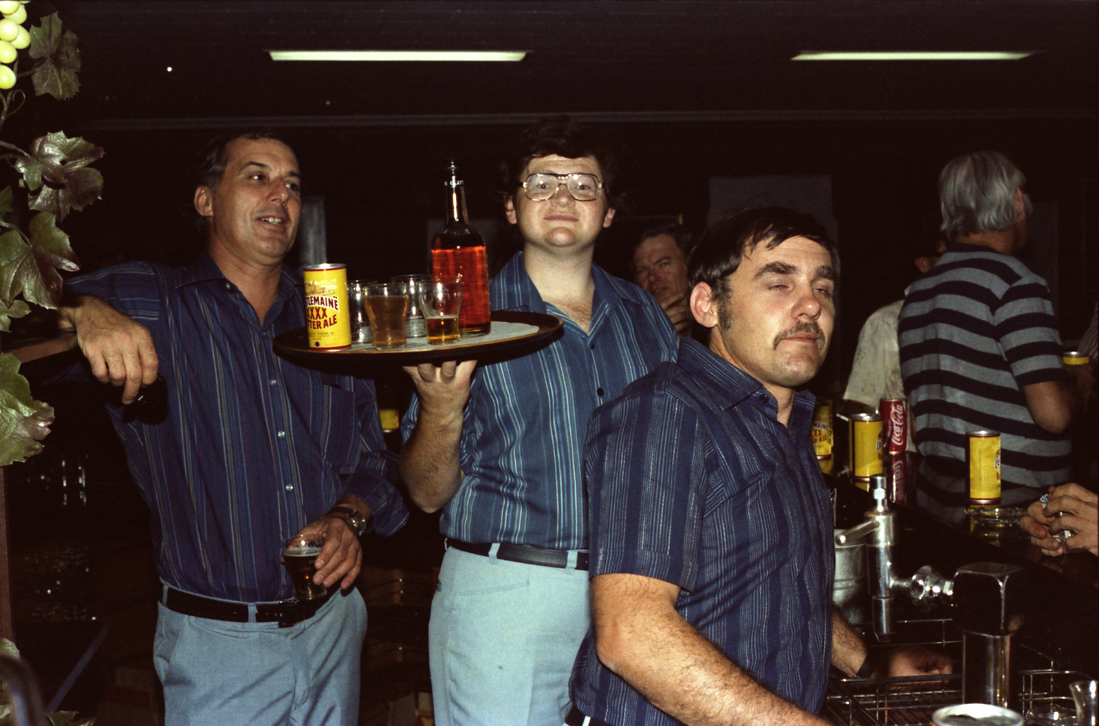Graham Rees, Tony Bird, Wilber, Don McElwain The Prentice Computer Centre Bar Staff - its was purely co-incidental that all three had almost the same shirt!