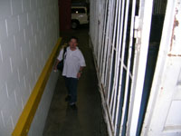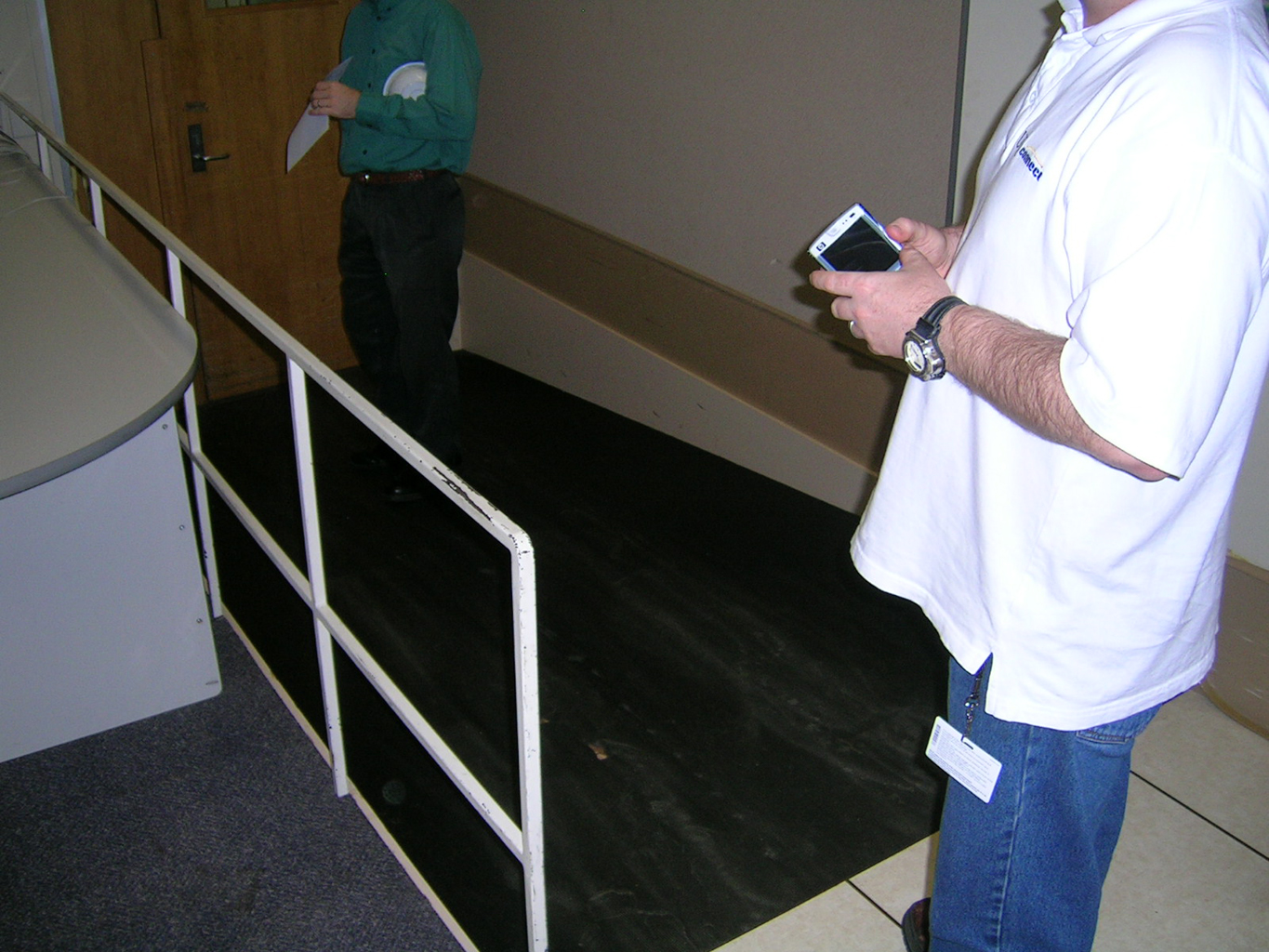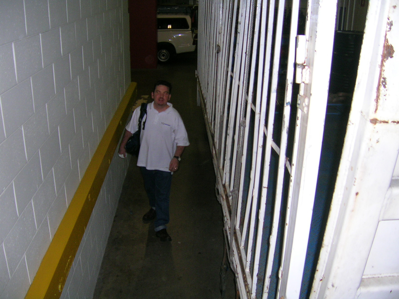 We have to go down this ramp. But the Fujitsu engineer warns that the ramp is not strong, and will not support the weight of the SAN! Now we find out that steel plates were placed over this ramp when the device was originally wheeled in.